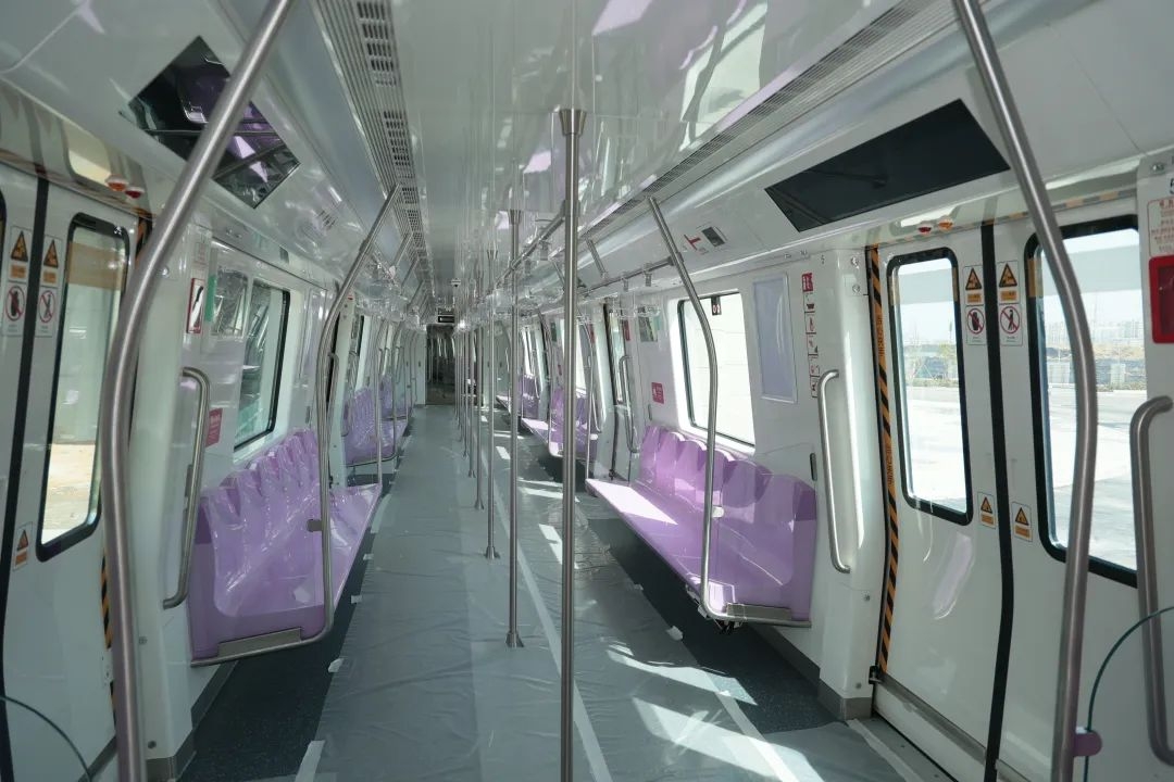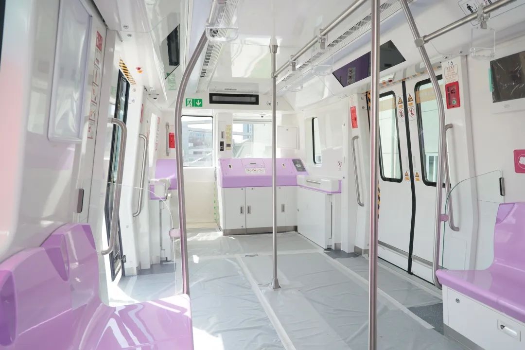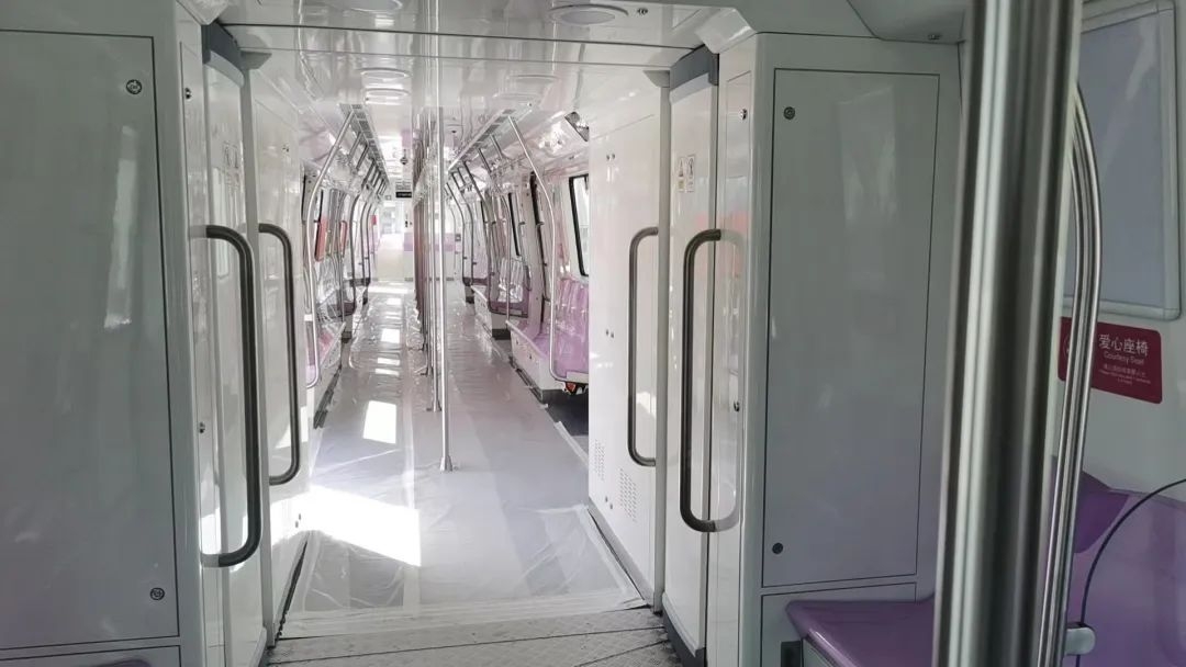 走进车厢, 浪漫迷人的紫色座椅映入眼帘, 地面上还铺着一层保护膜。