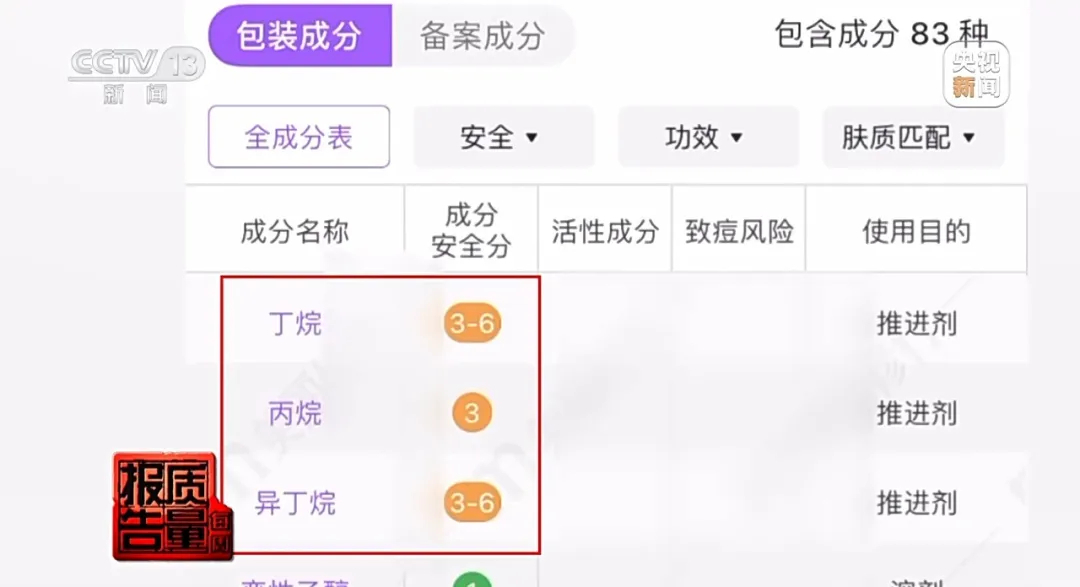 此外,还含有丁烷、丙烷、异丁烷,它们在成分分析软件上被统称为推进剂。实际上,这是绝大多数防晒喷雾都含有的成分,也是打火机燃料里的主要成分。这就意味着,如果操作不当或在使用时突遇明火,极有可能引火上身。