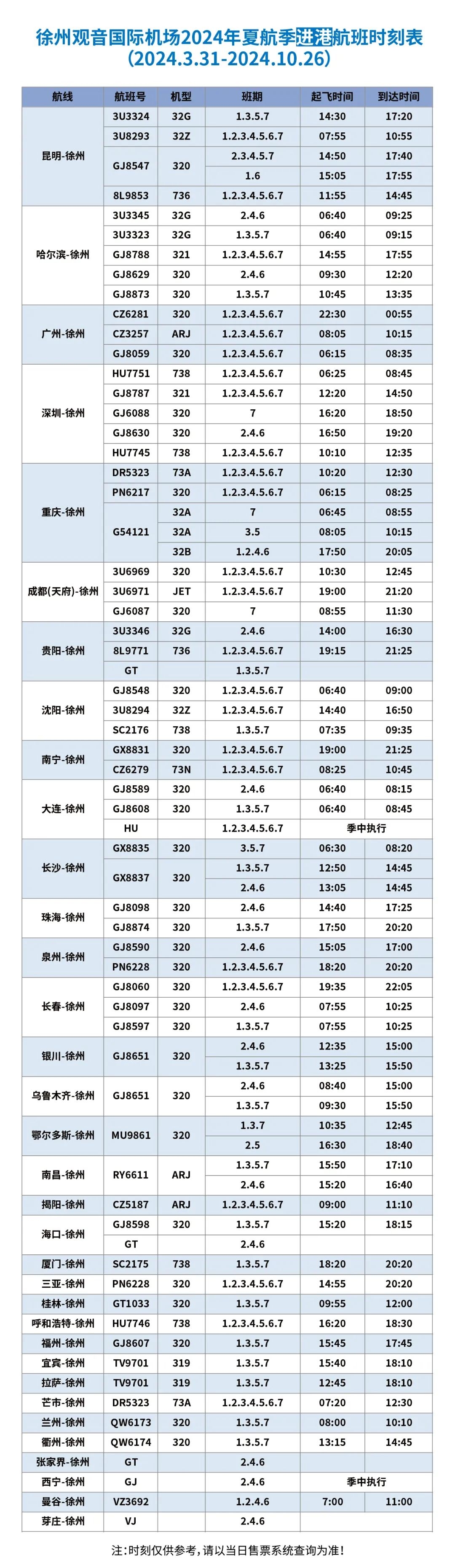 2024年夏航季航班时刻表