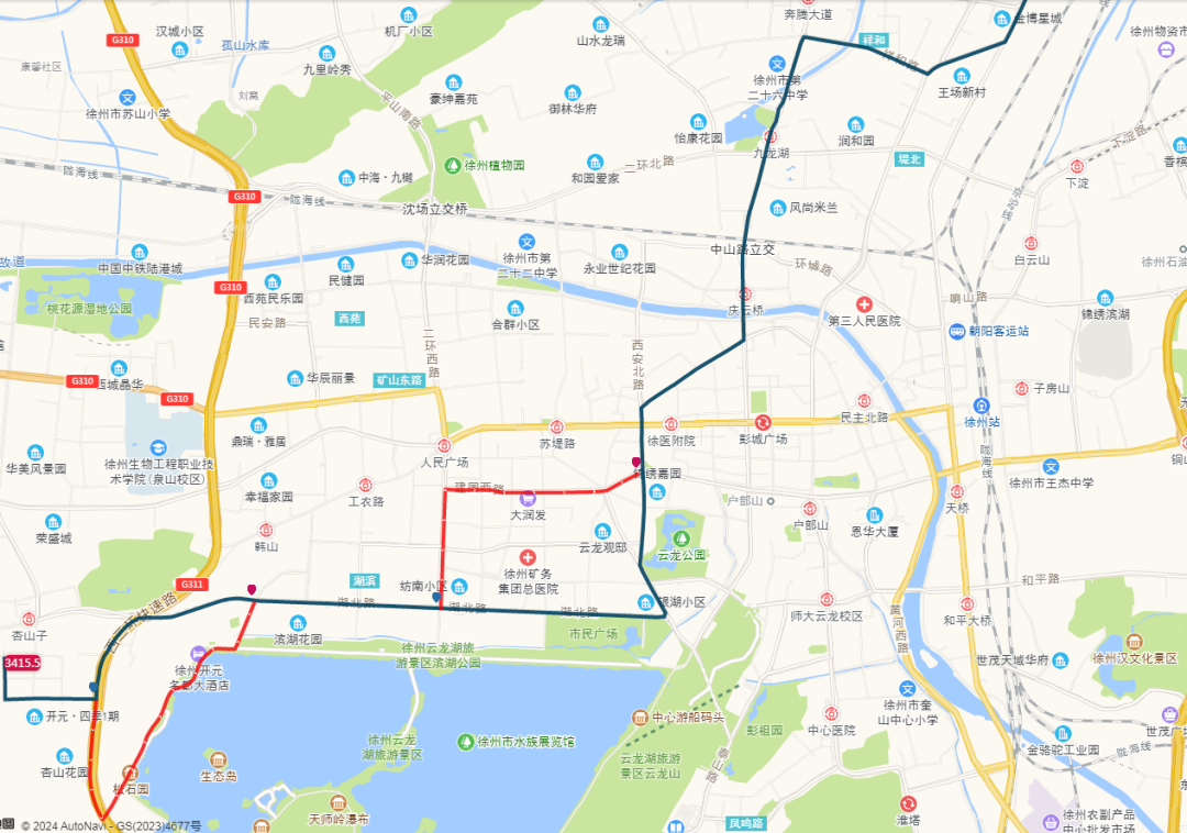 途经道路:104国道、迎宾路、欣欣路、学苑路、上海路、同昌路、南京路、湘江路、黄山路、长江西路、嵩山路、彭祖路。