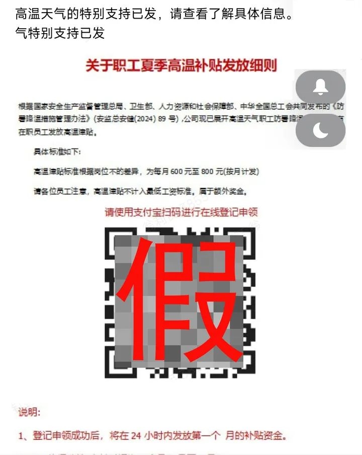 引诱受害人扫描二维码,通过所谓“官方网页”或是“官方申领表格”办理“高温补贴”等事项。