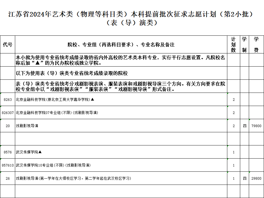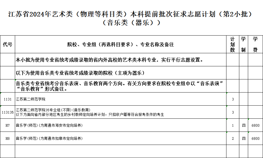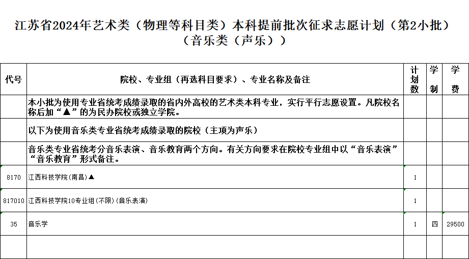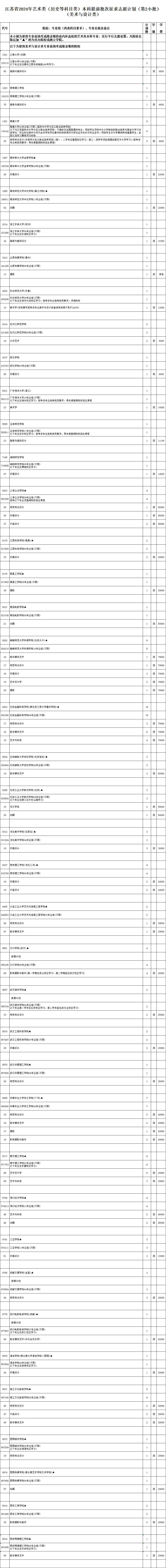 本次征求志愿的具体计划详见《江苏省2024年普通高校招生体育类本科提前批次征求志愿计划》《江苏省2024年普通高校招生艺术类本科提前批次征求志愿计划》(考生可登录江苏省教育考试院门户网站www.jseea.cn查询)。