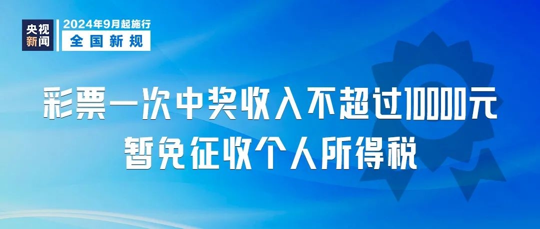 《关于彩票兑奖与适用税法有关口径的公告》9月1日起执行。彩票一次中奖收入不超过10000元暂免征收个人所得税。电脑彩票以同一人在同一期同一游戏中获得的全部奖金为一次中奖收入,即开型彩票以一张彩票奖金为一次中奖收入。