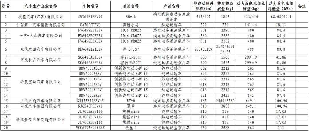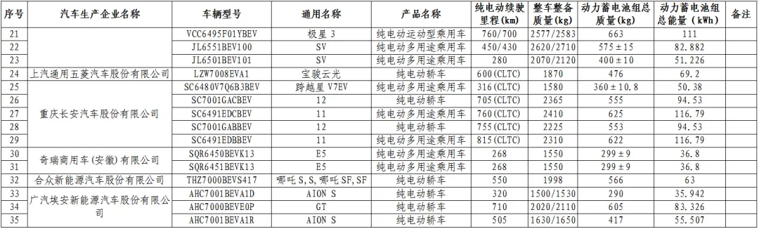 (第九批)纯电动汽车-乘用车车型如下: