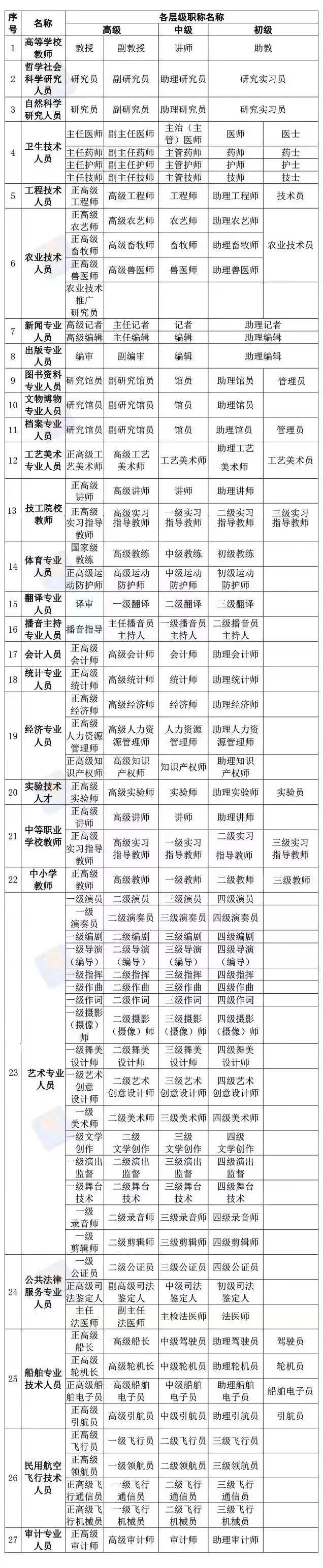 职称评审结果一般分为高级、中级、初级三个层级,但具体到不同专业,职称名称又有所不同。