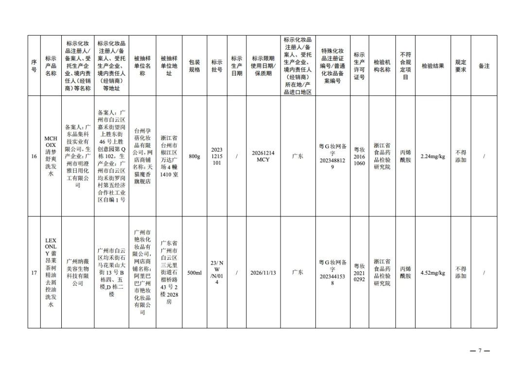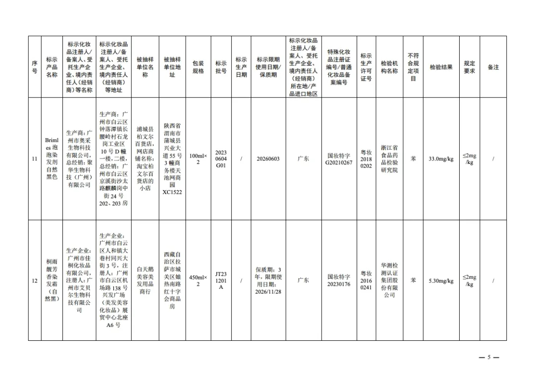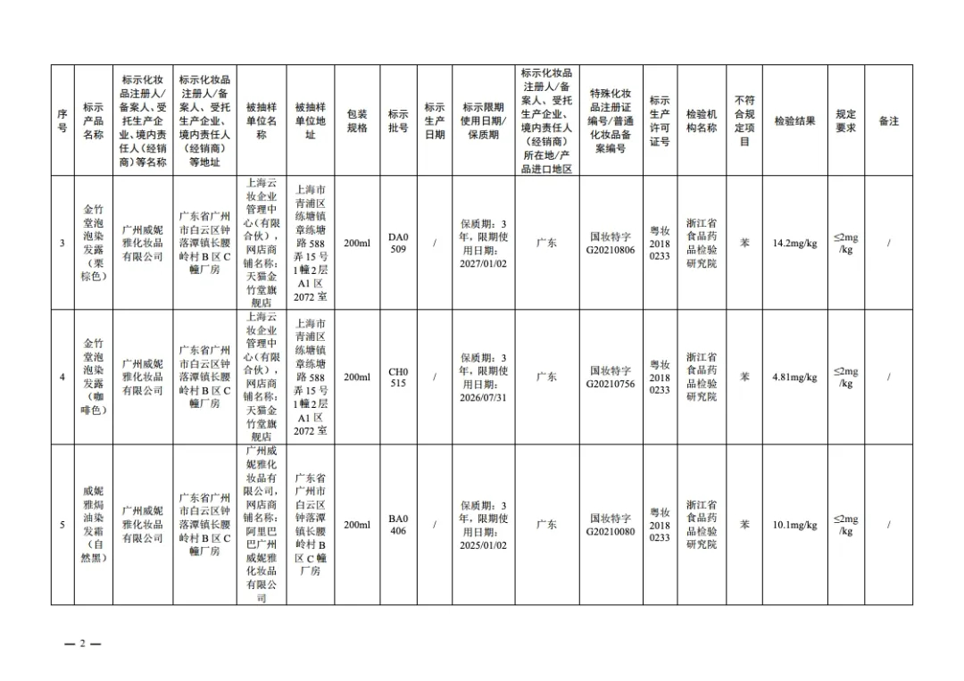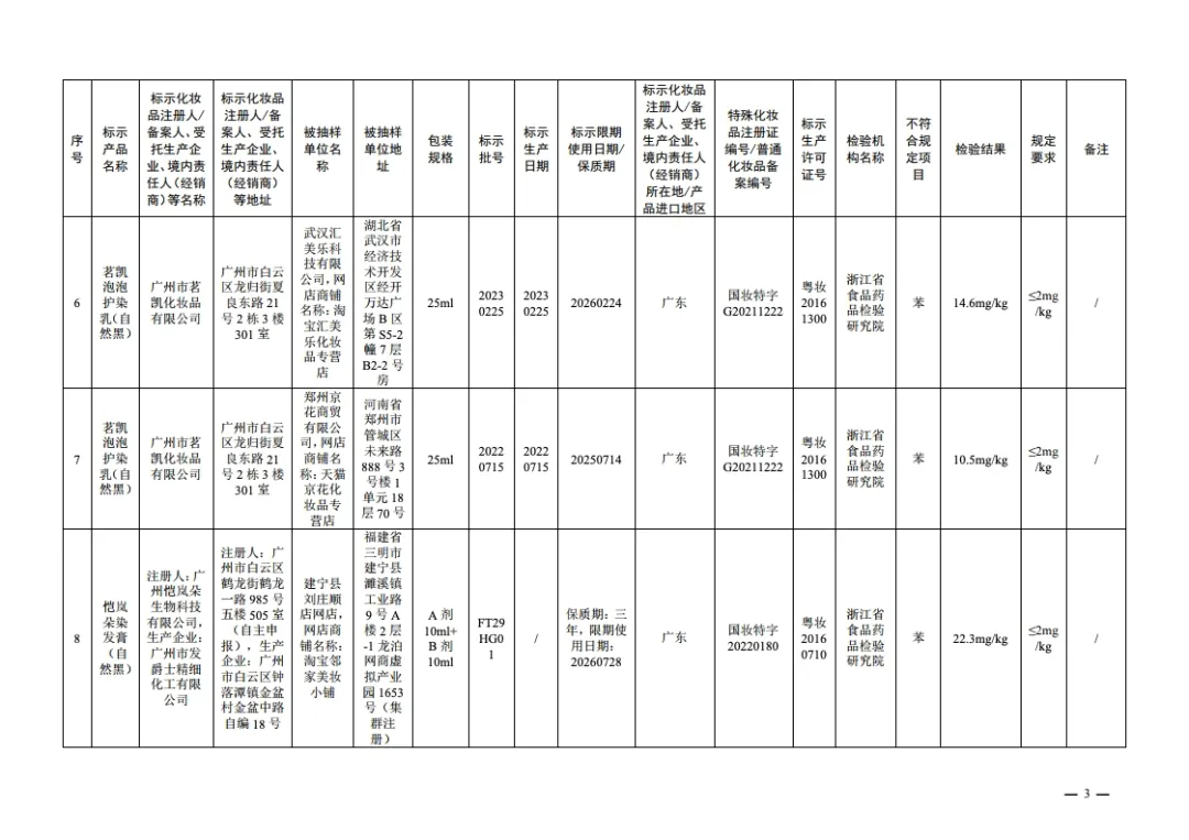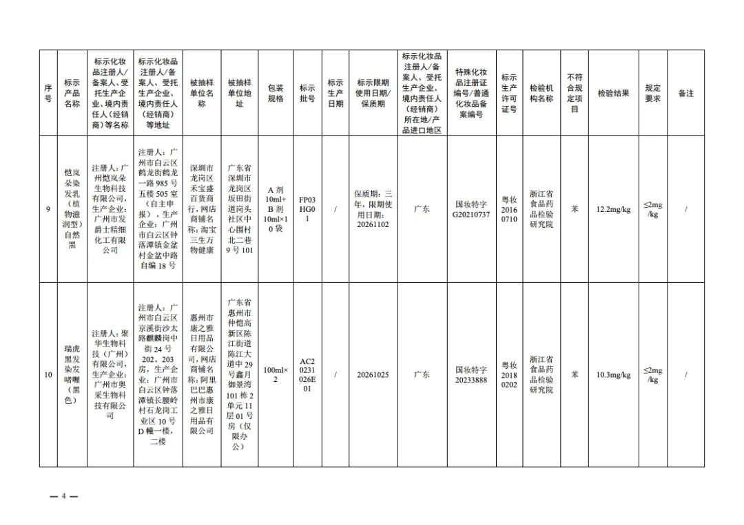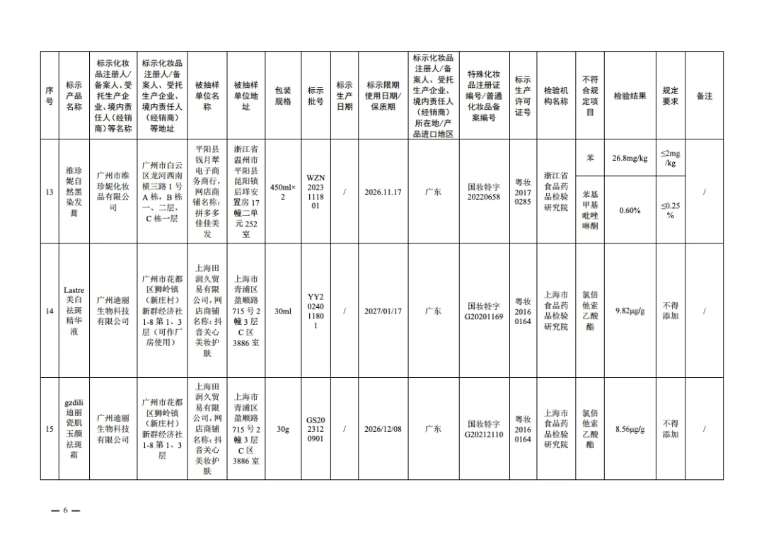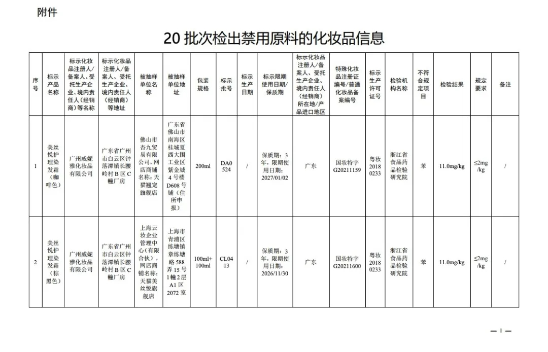 国家药监局14日发布通告称,在2024年国家化妆品抽样检验工作中,经浙江省食品药品检验研究院等单位检验,产品标签标示为广州威妮雅化妆品有限公司生产的美丝悦护理染发霜(咖啡色)等20批次化妆品不符合规定,检出《化妆品安全技术规范(2015年版)》中规定的禁用原料。