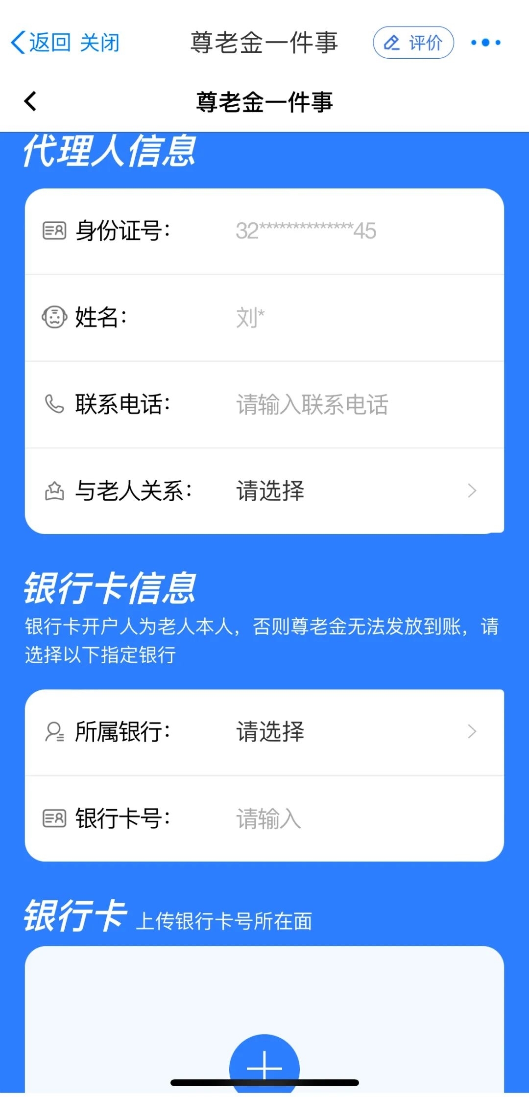 填写老年人基本信息、代理人信息、银行卡信息,点击办理完成申报。