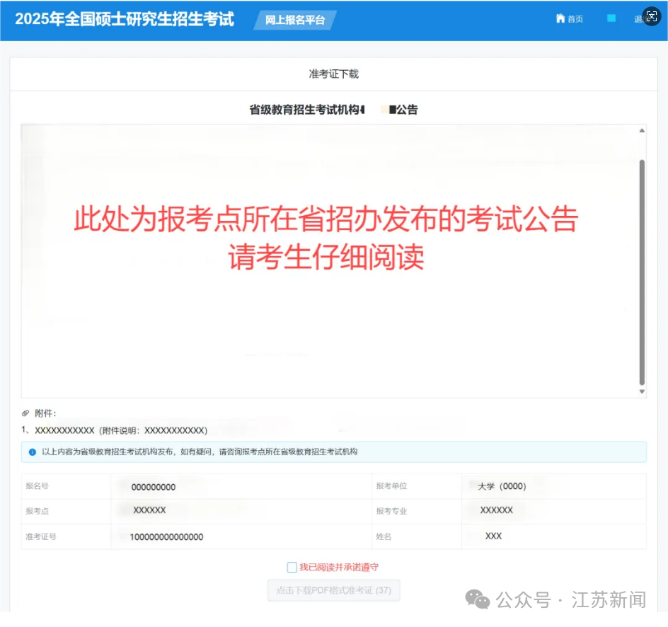 各位考生请注意,这个页面上的提示一定要认真阅读,然后勾选“我已阅读并承诺遵守”后,再点击“下载PDF格式准考证”的按钮。