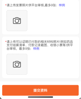 上传处方照片、发票照片以及可以证明实际购药支付资料的其他相关材料照片。