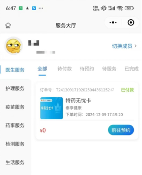 01点击申请后跳转至服务大厅,可以看到平台已自动为在档困难职工发放“特药无忧卡”服务包,点击“前往预约”查看所有权益。