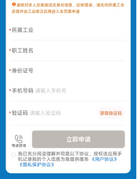 若身份信息有误,则需先向所属工会反馈并由工会修正后再进入此页面申请;若手机号有误或需要更改,则可更改手机号,获取验证码并验证后,点击立即申请按钮。