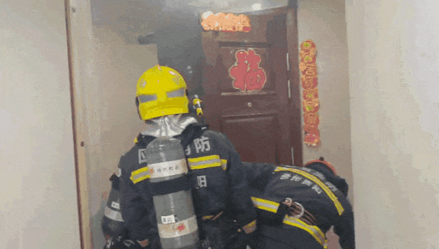 消防员破拆房门后成功将火扑灭