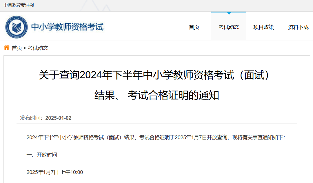 中小学教师资格考试(面试)结果