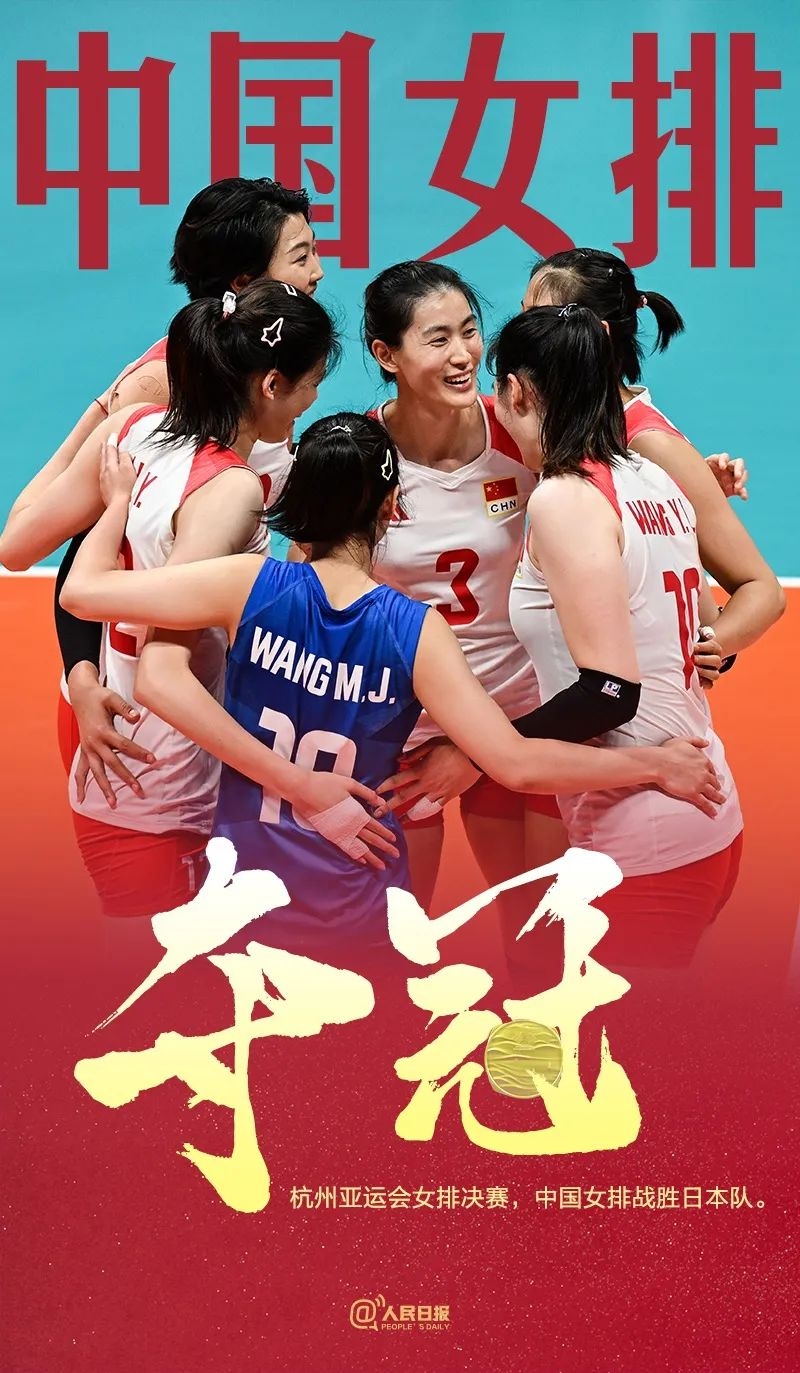 10月7日,在杭州亚运会女排决赛中,中国女排3比0战胜日本队,以六战全胜的战绩成功卫冕,这也是中国女排队史第9枚亚运金牌。