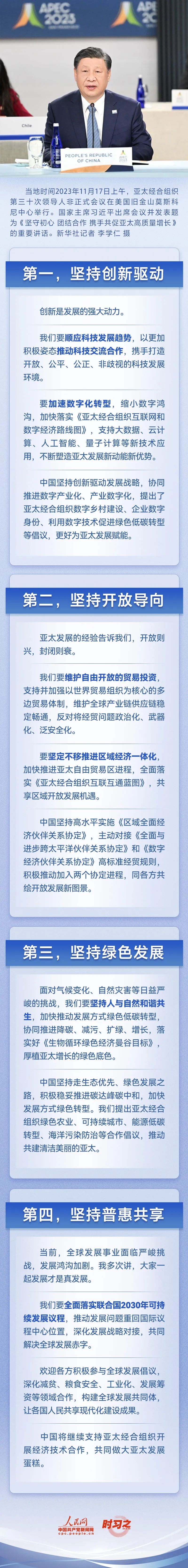 当地时间2023年11月17日上午,亚太经合组织第三十次领导人非正式会议在美国旧金山莫斯科尼中心举行。国家主席习近平出席会议并发表题为《坚守初心 团结合作 携手共促亚太高质量增长》的重要讲话。习近平主席就携手共促亚太高质量增长提出建议。