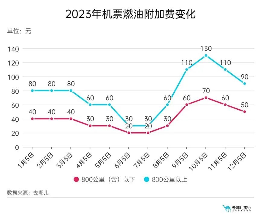 自2023年12月5日(出票日期)起,成人旅客800公里(含)以下航线每位旅客收取50元燃油附加费,800公里以上航线每位旅客收取90元燃油附加费。相较于调整前分别降低了10元和20元。