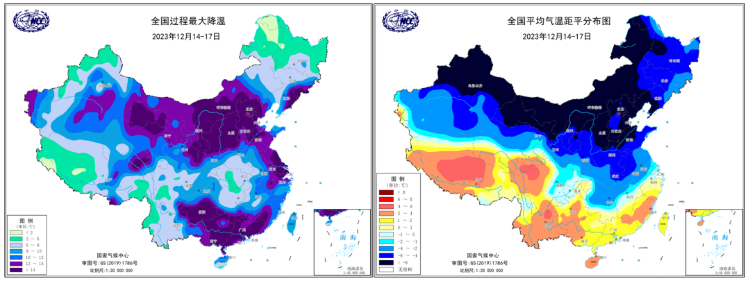 12月14-17日全国大部降温迅猛(左)气温远低于历史同期(右,“距平”为实测数据与历史同期之差)