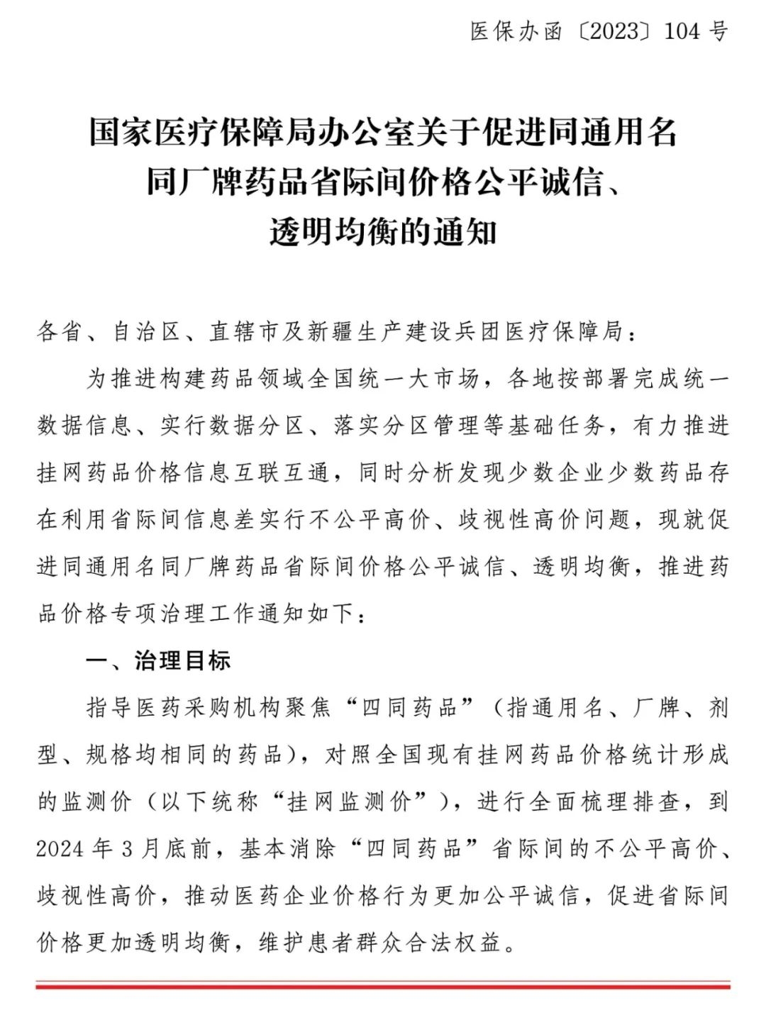 国家医保局于2023年12月底印发了《关于促进同通用名同厂牌药品省际间价格公平诚信、透明均衡的通知》,主要目的是推动消除省际间的不公平高价、歧视性高价。通过汇总全国各省份集中采购平台挂网销售药品的价格数据,重点对“四同药品”,即通用名、剂型、规格、厂家均相同的药品,统计了分布集中、有活跃交易的价格水平,作为监测结果推送给各省份医保局以及当地的药品集中采购机构。