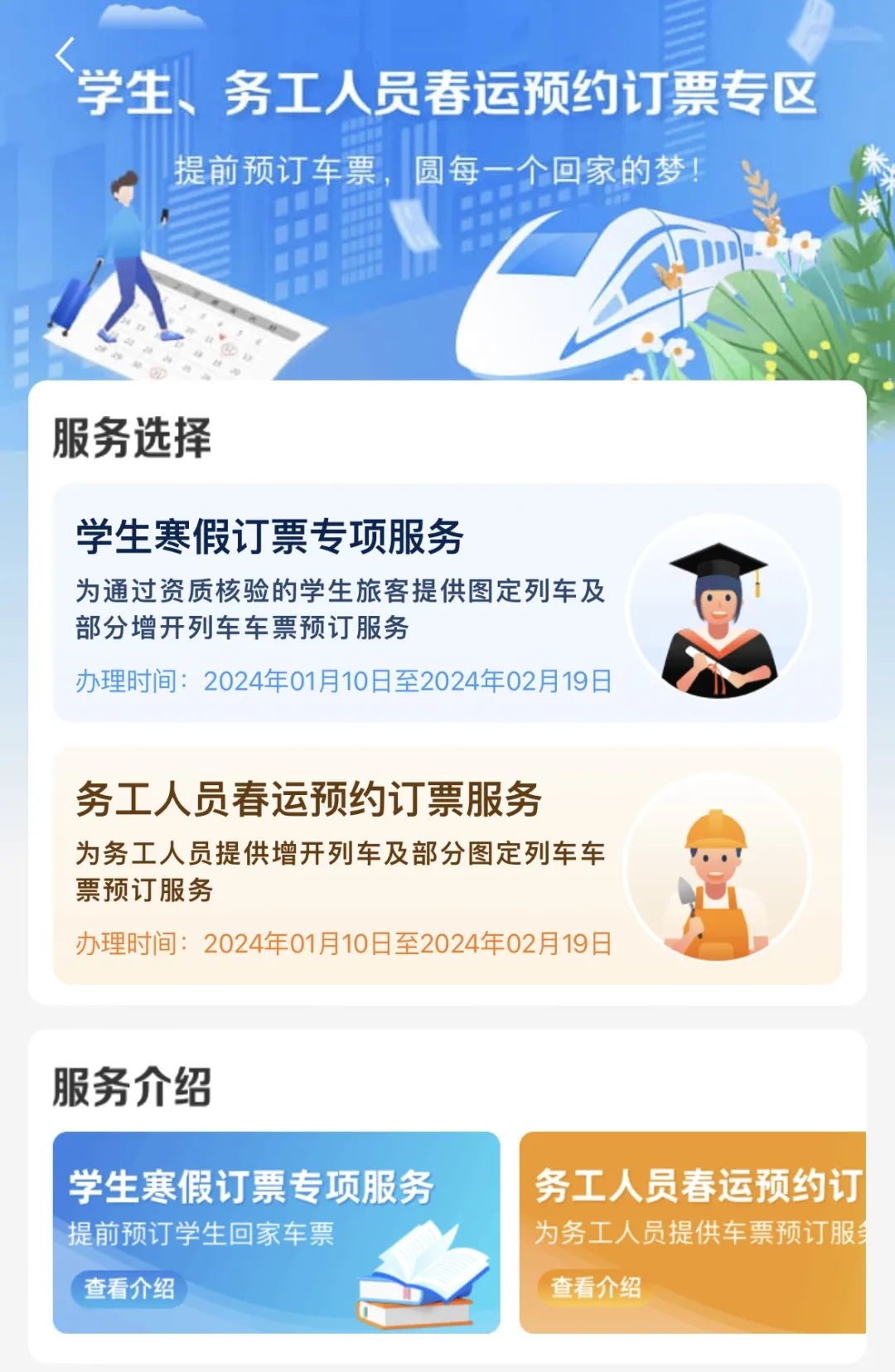 自1月10日零时起,铁路12306手机客户端推出春运期间学生、务工人员专区预约购票功能,符合条件的旅客朋友可通过12306手机客户端专区预约购买春运期间往返火车票,这是铁路12306保障春运重点群体出行的便民举措。