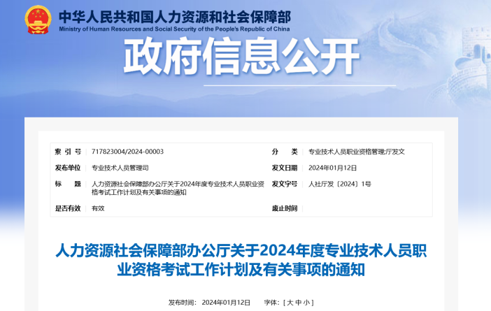 近日,人力资源社会保障部办公厅印发《关于2024年度专业技术人员职业资格考试工作计划及有关事项的通知》。