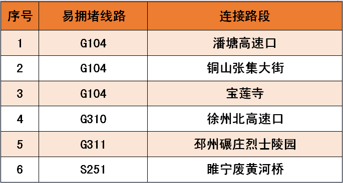 清明假期,我市城市出入口中,除城南方向(三堡)车流量小,其他方向出入口车流量均较大,尤其是西北方向(南岗)出城方向流量最高。预计清明假期全市普通国省干线公路有6个易缓行路段,集中在陵园连接路段和城市出入口,部分路段在高峰时段可能会出现短时间拥堵。分别为:G104潘塘高速口、G104铜山张集大街、G104宝莲寺、G310徐州北高速口、G311邳州碾庄烈士陵园、S251睢宁废黄河桥。
