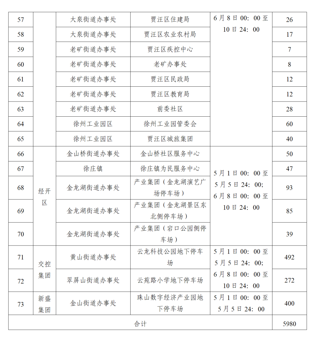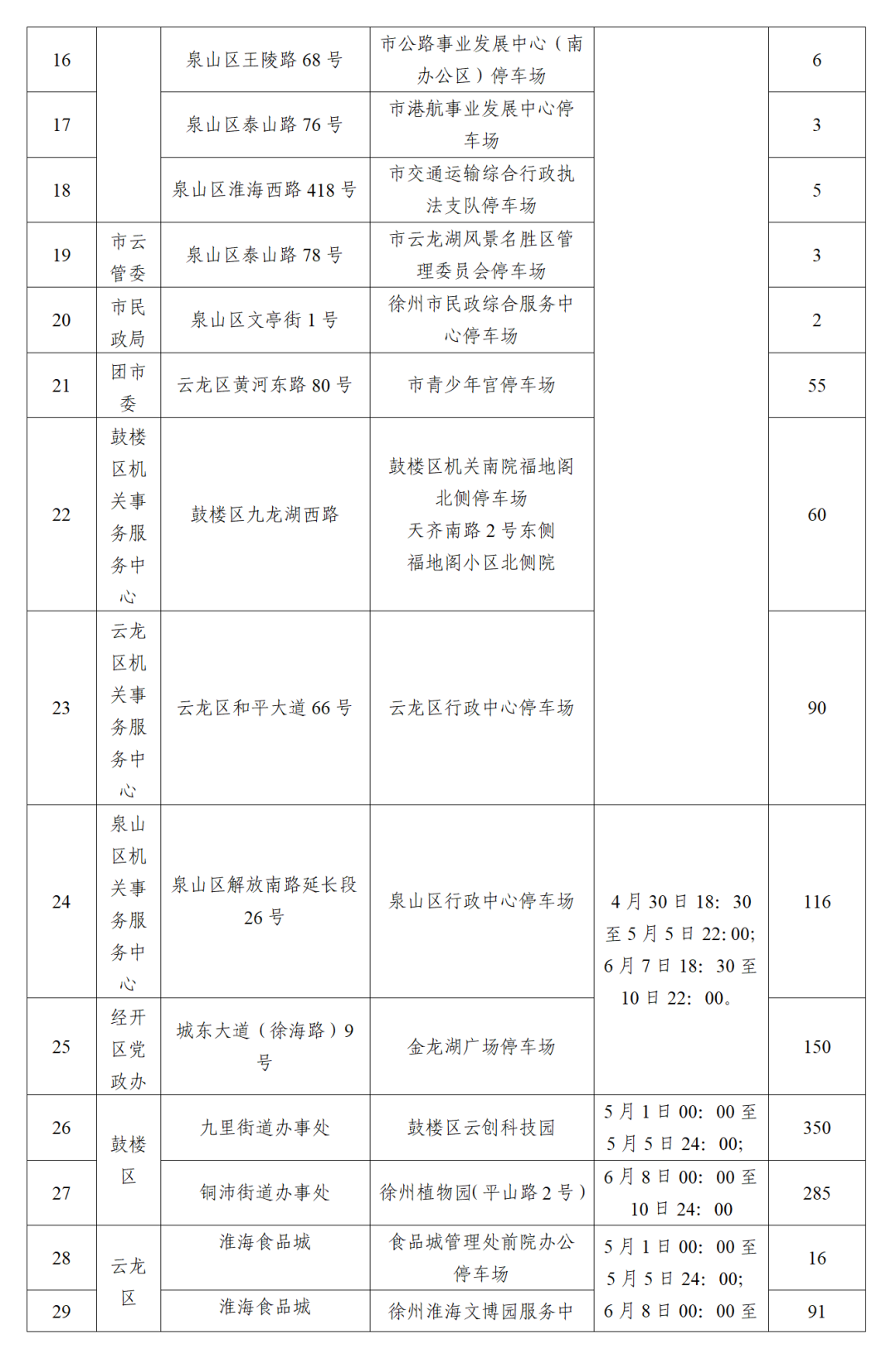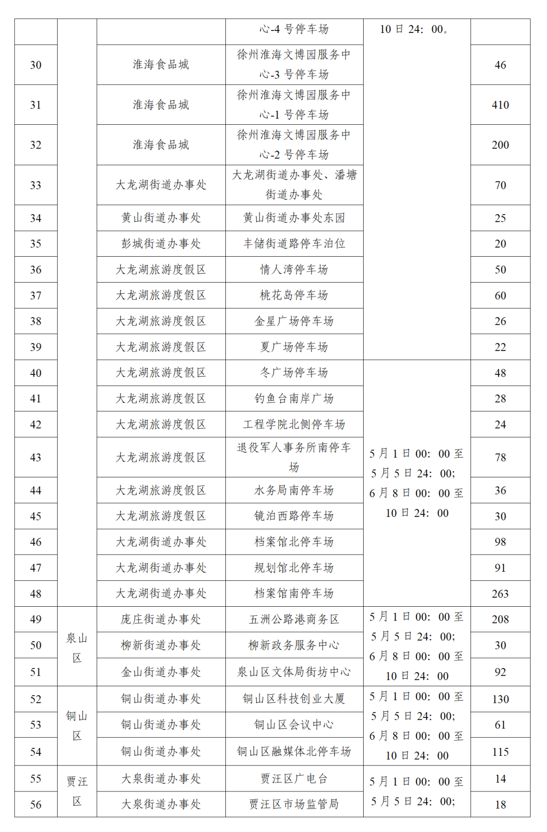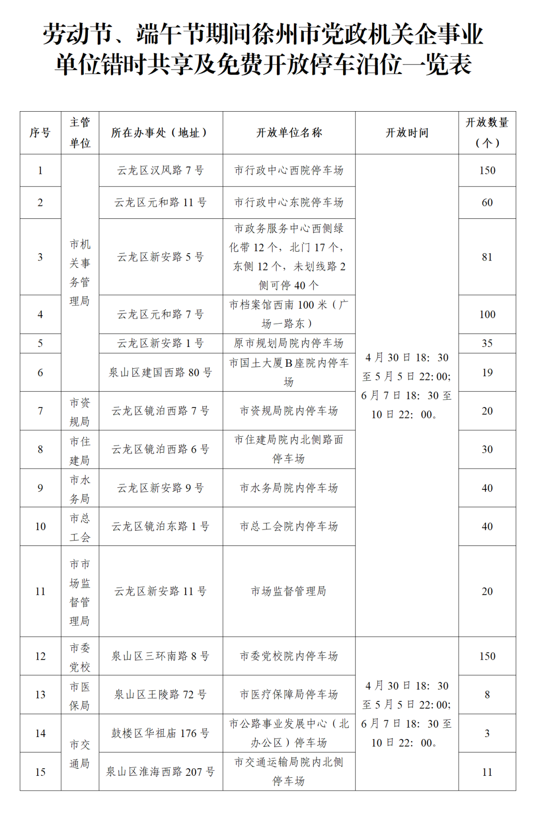 为有效缓解节假日游客停车难问题,更好方便群众出行,经市委、市政府研究决定,徐州市部分党政机关单位内部停车场在劳动节、端午节假日期间免费向社会开放,同时主城区(包括鼓楼区、云龙区、泉山区、铜山区、贾汪区、经开区)部分企事业单位内部、经营性停车场在劳动节、端午节假日期间错时共享免费向社会开放,现将具体事项公告如下: