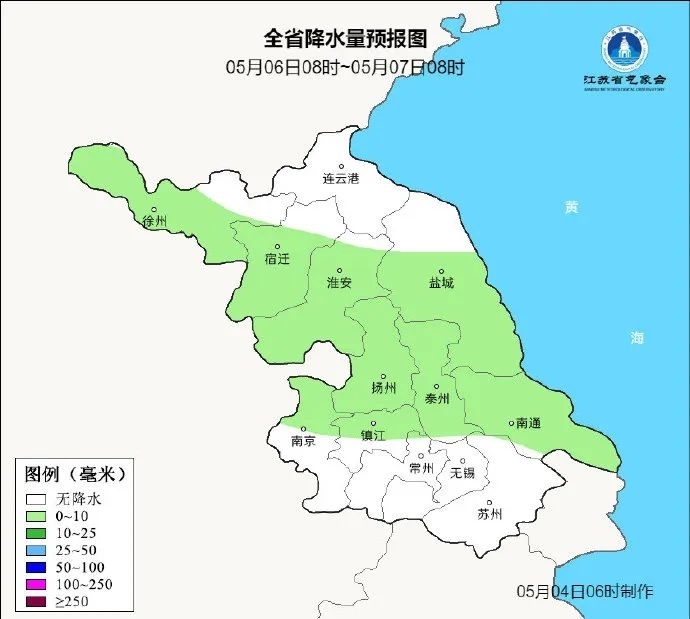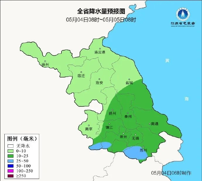 据@江苏气象2024年5月4日6时发布天气预报显示:5月4日08时至5月5日08时,全省阴有阵雨或雷雨,其中淮河以南地区雨量中等,局部大雨。