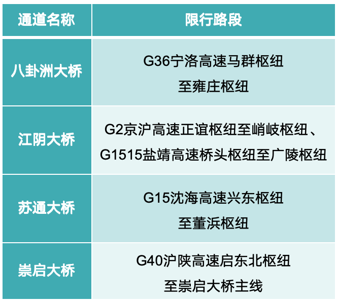 “五一”返程期间,八卦洲大桥、江阴大桥、苏通大桥、崇启大桥实施黄牌货车限时错峰出行政策,限行时段为5月4日、5日每日8时-22时,限行路段如图所示。