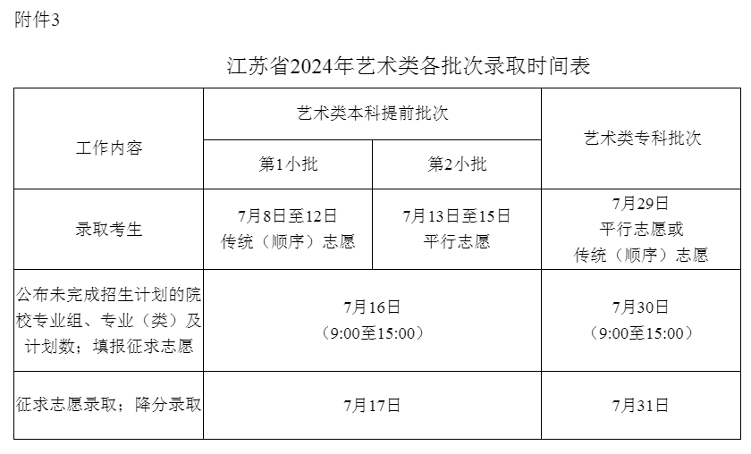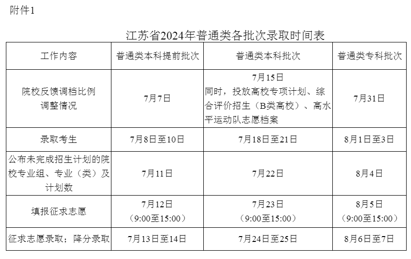 2024年,江苏省普通高校招生各科类录取批次和时间安排如下。