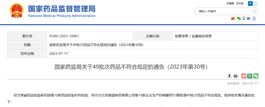 经甘肃省药品检验研究院等10家药品检验机构检验,标示为北京朗迪制药有限公司等16家企业生产的碳酸钙D3颗粒等49批次药品不符合规定。现将相关情况通告如下: