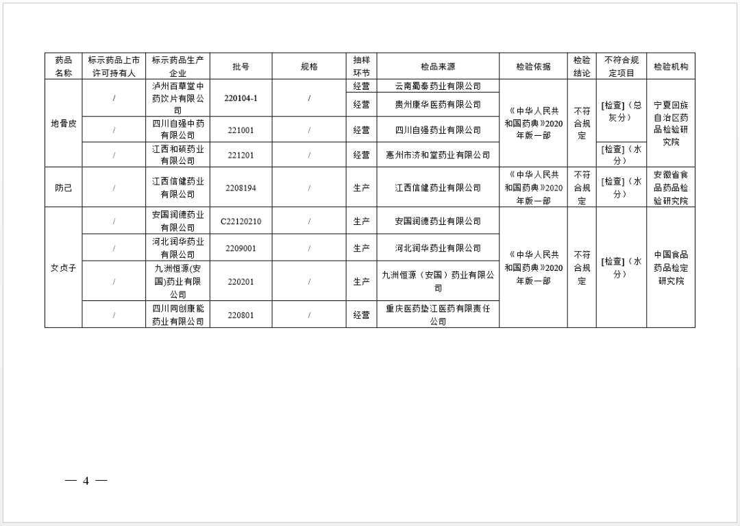 经宁夏回族自治区药品检验研究院检验,标示为泸州百草堂中药饮片有限公司、四川自强中药有限公司、江西和硕药业有限公司生产的3批次地骨皮不符合规定,不符合规定项目包括总灰分、水分。
