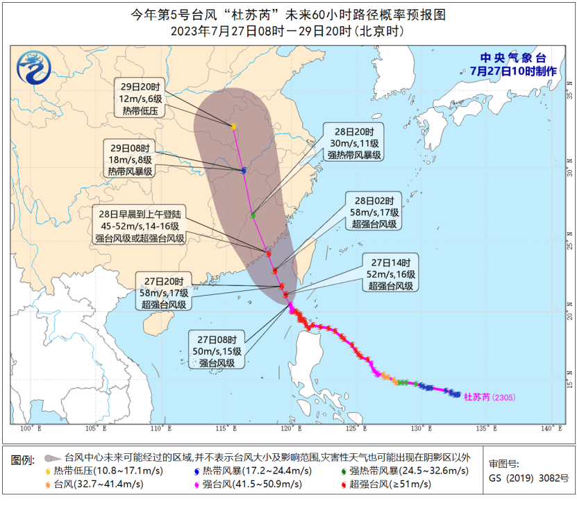 台风消息:今年第5号台风(强台风级别)“杜苏芮”今天10时中心位置在距离福建省厦门市南偏东方向约440公里,也就是北纬20.8度,东经119.7度,中心气压940百帕,近中心最大风力15级,目前以每小时10-15公里左右的速度向北偏西方向移动,强度有所增强。受其影响,预计29日至30日我市将有明显风雨天气,请有关方面注意!