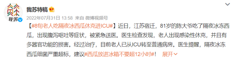 2022年,江苏省广播电视总台报道,江苏宿迁81岁的陈大爷吃了隔夜冰冻西瓜,出现腹泻呕吐等症状,被紧急送医。医生检查发现,老人出现感染性休克,并且有多器官功能的损害。