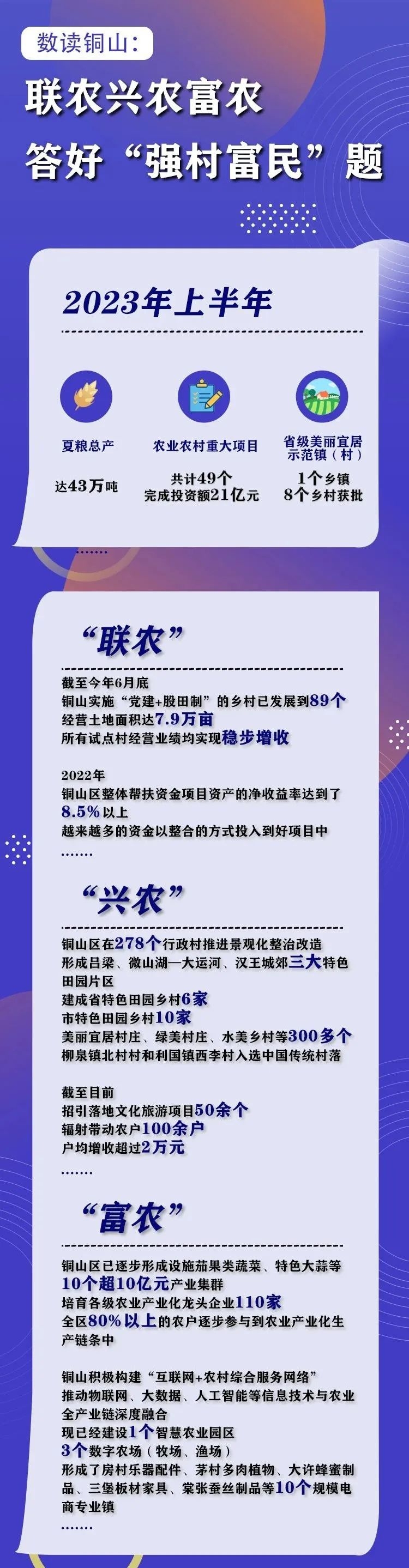 与此同时,铜山积极构建“互联网+农村综合服务网络”,现已经建设1个智慧农业园区、3个数字农场(牧场、渔场),形成了房村乐器配件、茅村多肉植物、大许蜂蜜制品、三堡板材家具、棠张蚕丝制品等10个规模电商专业镇。以农村电商等新业态让更多村民在家门口实现就业,涌现出一批爱农村、懂技术、会经营、善管理的“新农人”。
