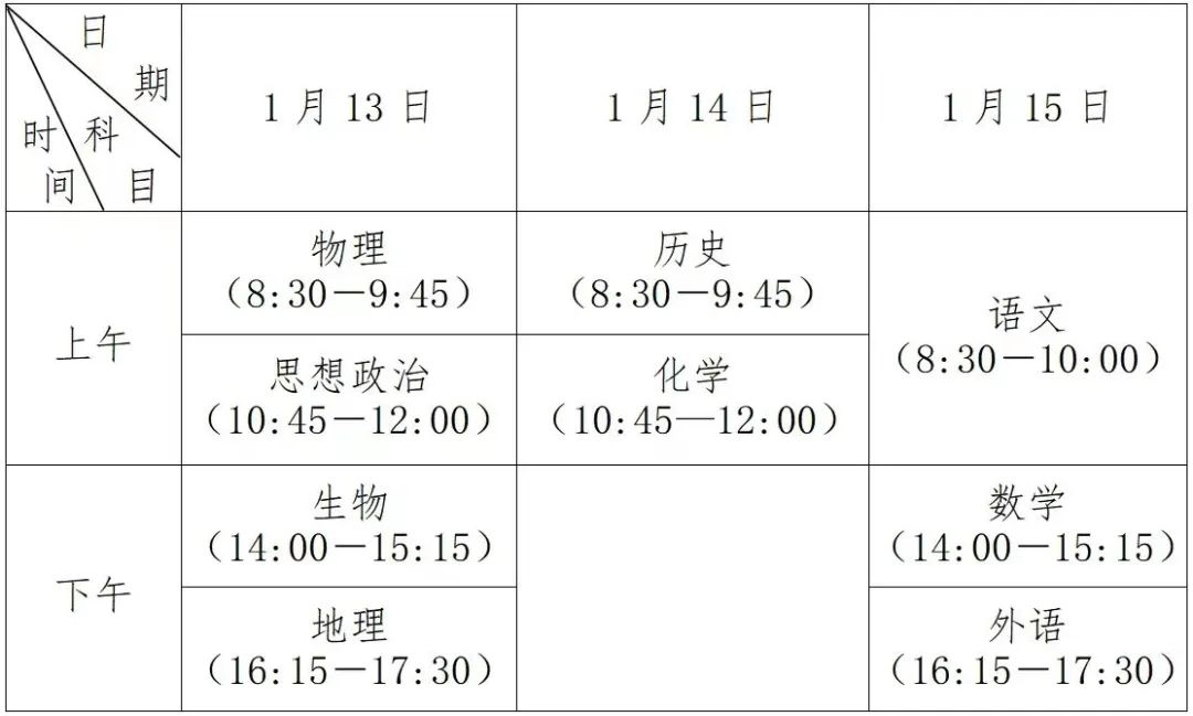 二、语文、数学、外语、思想政治、历史、地理、物理、化学、生物科目考试(笔试)考试时间为2024年1月13—15日。除语文科目考试时长为90分钟外,其他各科均为75分钟。具体如下: