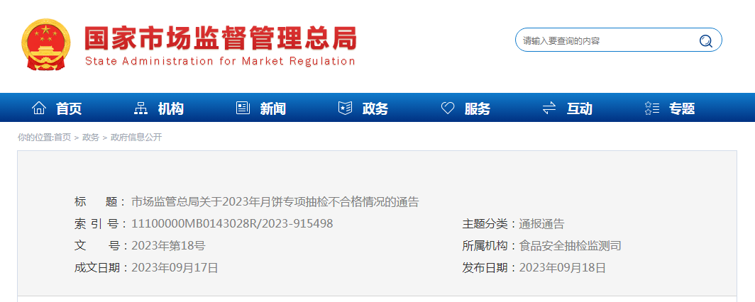 通告称,近期,市场监管总局组织开展月饼专项监督抽检,采取现场抽样和网络抽样方式在全国随机抽取月饼样品400批次,发现6批次样品不合格,分别是3批次微生物污染、2批次食品添加剂超限量使用和1批次质量指标不达标。