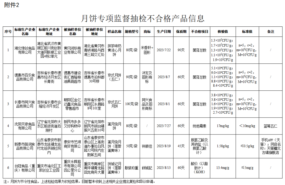 (一)湖北省黄冈润华商业有限公司销售的、标称湖北绿创食品有限公司生产的抹茶味奶黄流心月饼,其中菌落总数不符合食品安全国家标准规定。