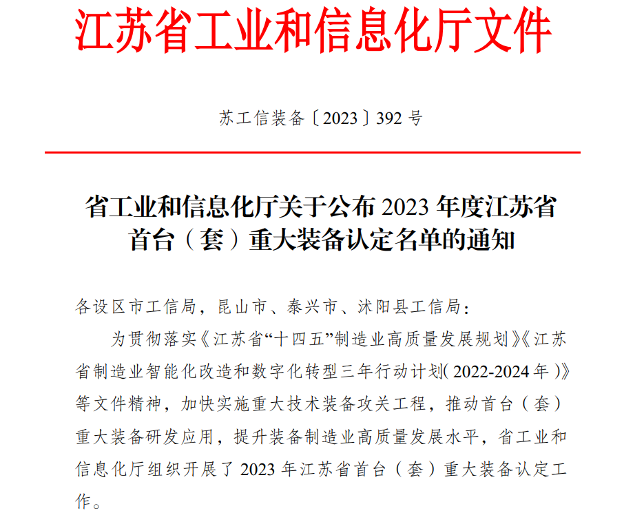 据悉,首台(套)重大技术装备是指国内实现重大技术突破、拥有知识产权、尚未取得市场业绩的装备产品。江苏省首台(套)重大装备认定旨在加快建设自主可控的先进制造业体系,推动制造业高质量发展,鼓励和引导装备企业开展技术创新。入选企业均为掌握装备生产的核心技术和关键工艺,在设计与制造技术等方面具有标志性突破或根本性改进,填补行业空白,代表了地区制造业的最高水平。