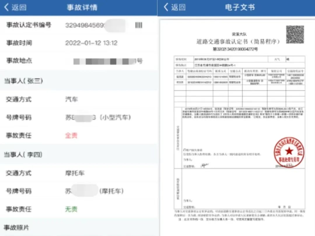 事故提交定责后,当事人可以通过“交管12123”APP【网办进度】查看事故处理进度;完成事故责任认定后,将通过手机短信告知当事人,当事人可通过“交管12123”APP查看事故责任及电子文书。