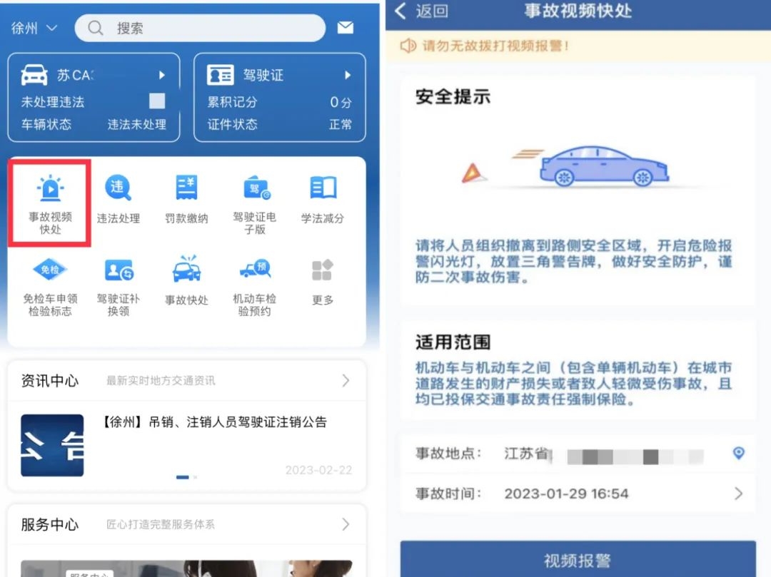 发生事故后,当事人在现场通过“交管12123”APP进行视频报警处理,系统自动定位事故地点信息。
