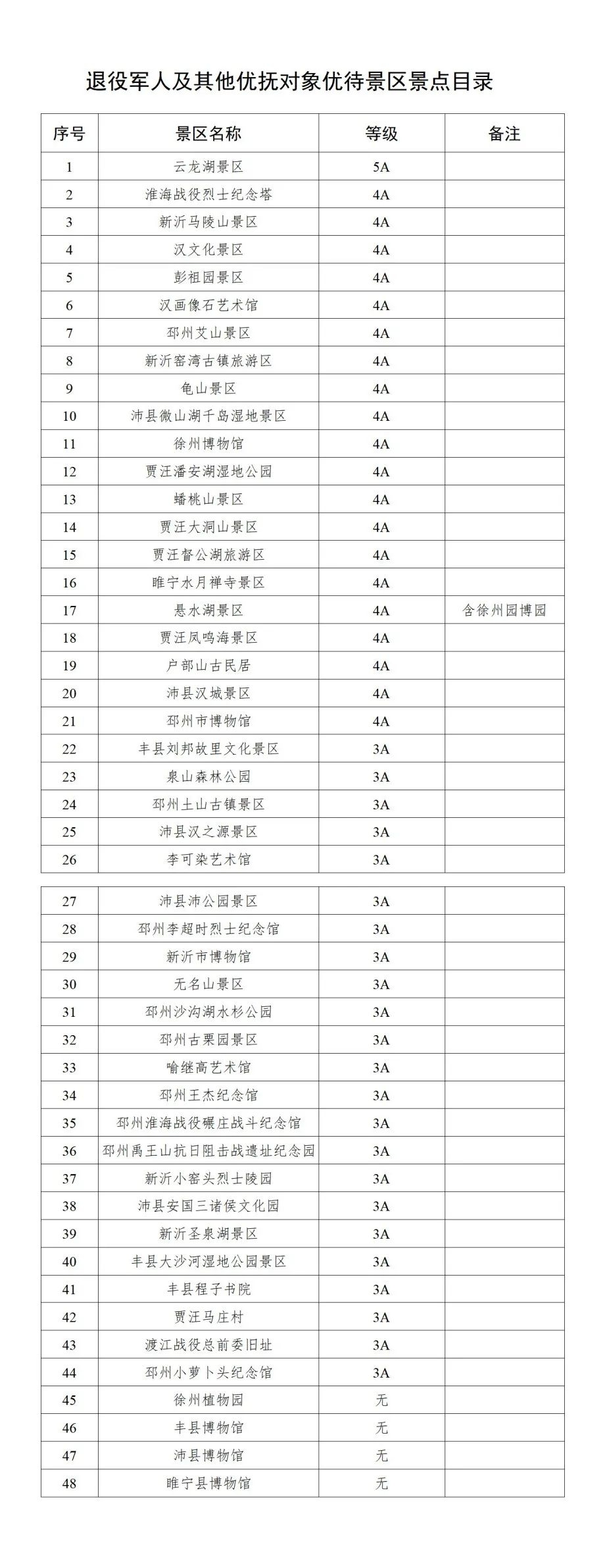 凭优待证在徐州市行政区域内免费乘坐市内公共交通工具;免门票参观游览国有博物馆、纪念馆、美术馆等公共文化设施和实行政府定价或指导价管理的公园、展览馆、名胜古迹、旅游景区,园中园、园内收费及夜游等项目除外。