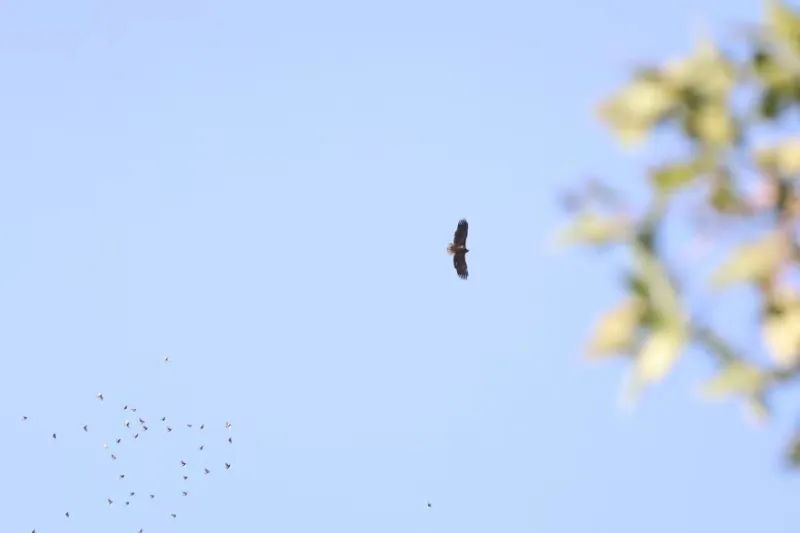 “大鸟体形庞大,双翅展开约有2米长,在几十只小鸟的围攻下丝毫没有忙乱。大鸟尾巴是白色的,很少见到,但又有点眼熟。我赶紧停车拿出相机拍摄。不到一分钟的时间,大鸟就摆脱小鸟的攻击,越飞越高。”马海军说,经过辨别,他确认这是一只白尾海雕,几年前他曾经在北京观测过。