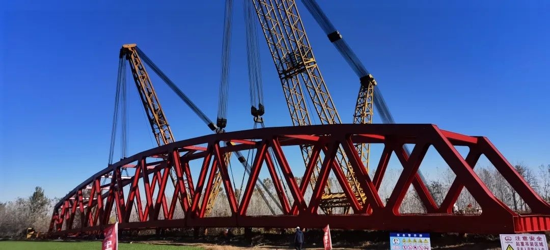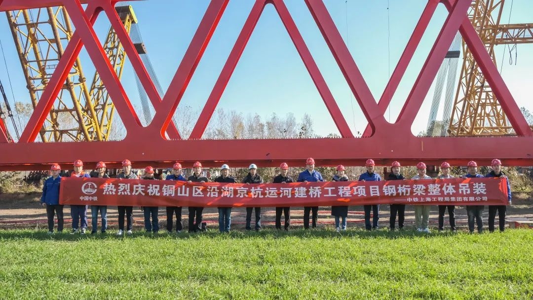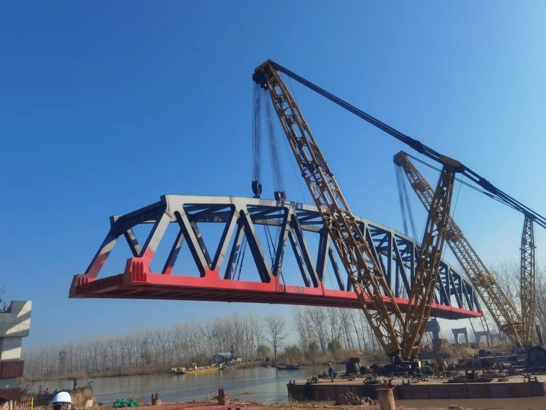 为保证本次吊装施工的安全,在钢桁梁吊装前运河面限时半封航,项目现场实行封锁施工。吊装过程中,在数十名施工人员和2台浮吊船的规范作业,密切配合下顺利完成了钢桁梁的起吊、移位、精调、安装。
