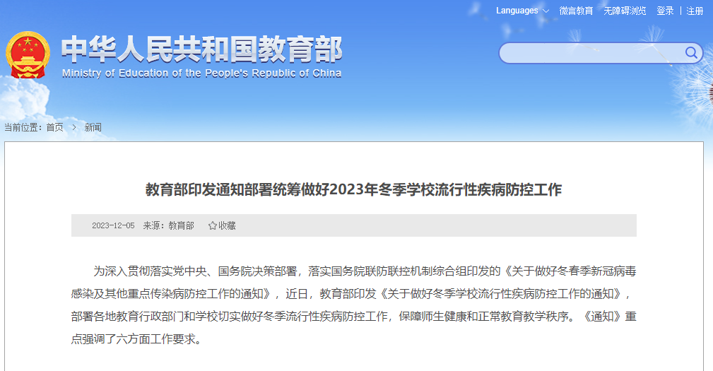 日前,教育部印发《关于做好冬季学校流行性疾病防控工作的通知》,部署各地教育行政部门和学校切实做好冬季流行性疾病防控工作,保障师生健康和正常教育教学秩序。《通知》重点强调了六方面工作要求。