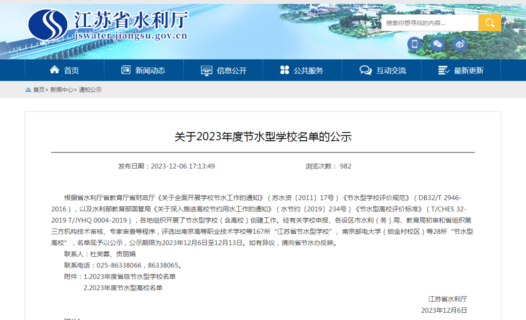 关于2023年度节水型学校名单的公示