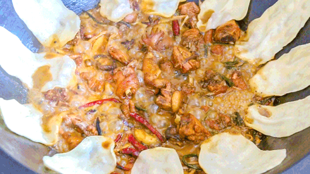 铜山人的冬天,离不开一锅热气腾腾的地锅鸡。距徐州市20公里的刘集镇棉布村,因为一道地锅鸡远近闻名,每逢节假日,很多食客都会慕名而来。地锅里是飘香的炖鸡肉,地锅边上铺着一层薄饼,饼一半焦脆,一半吸饱了汤汁,饼借菜味,菜借饼香,软滑与干香并存。