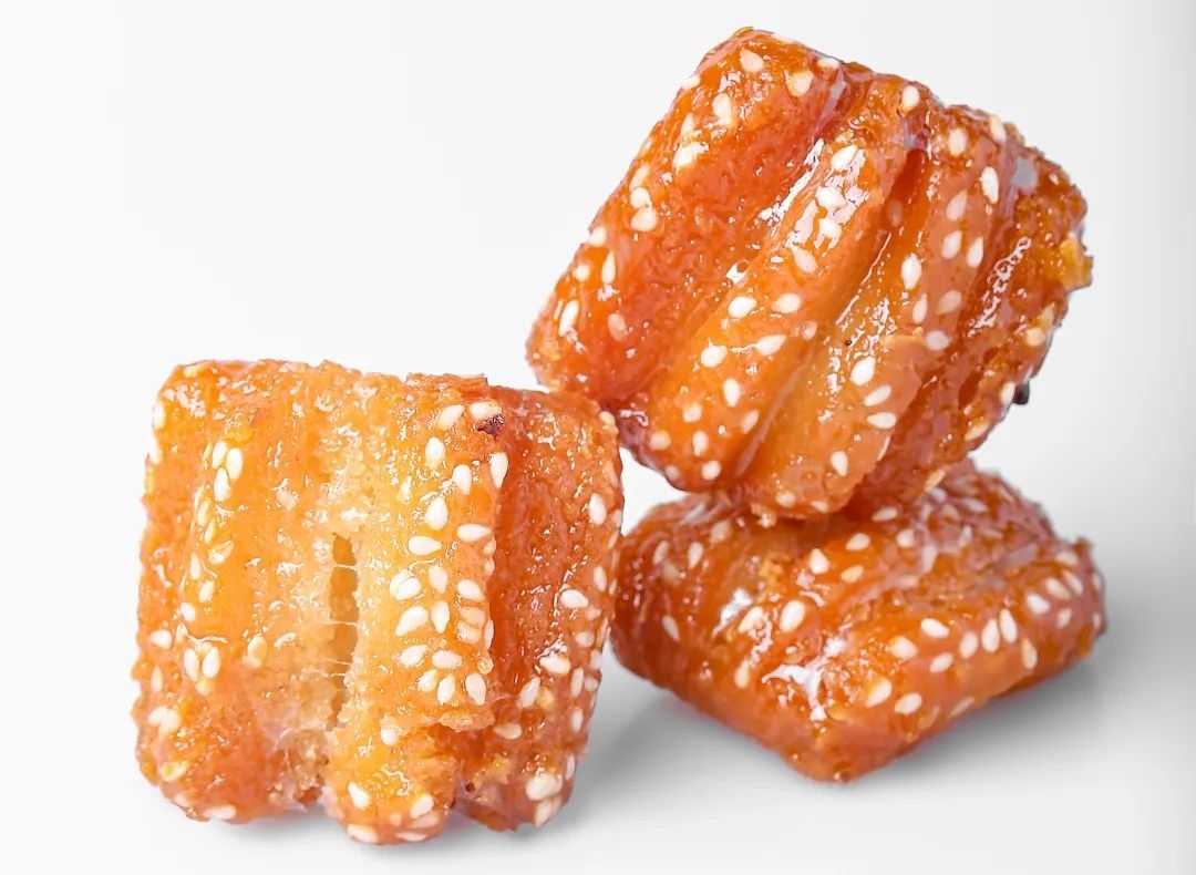 在铜山人的记忆中,包含蜜三刀在内的老八样是过年过节的“主角”,他们保留传统、做工精细又风味独特。在中国人眼中,“蜜”便是甜美,一个个金黄色的蜜三刀,白芝麻散落其上,晶莹剔透,外酥里嫩,蜜香扑鼻。