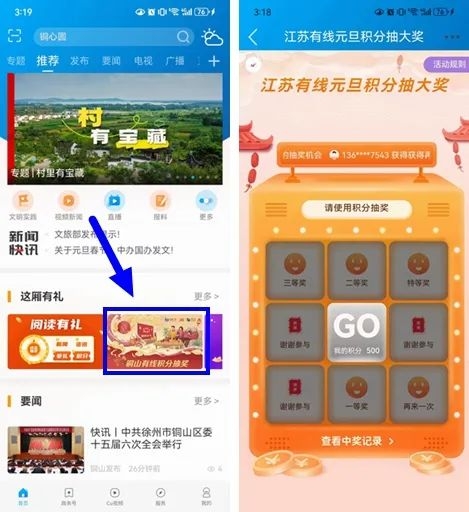 第二步:打开铜心圆APP首页,在“这厢有礼”板块找到【铜山有线积分抽奖】,点击进入开始抽奖。