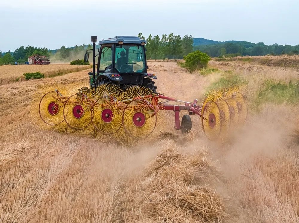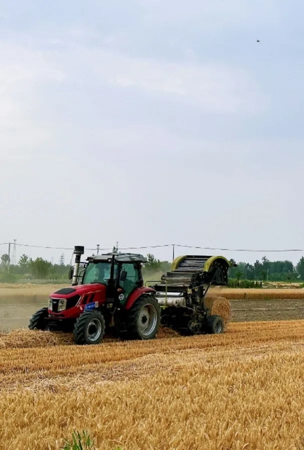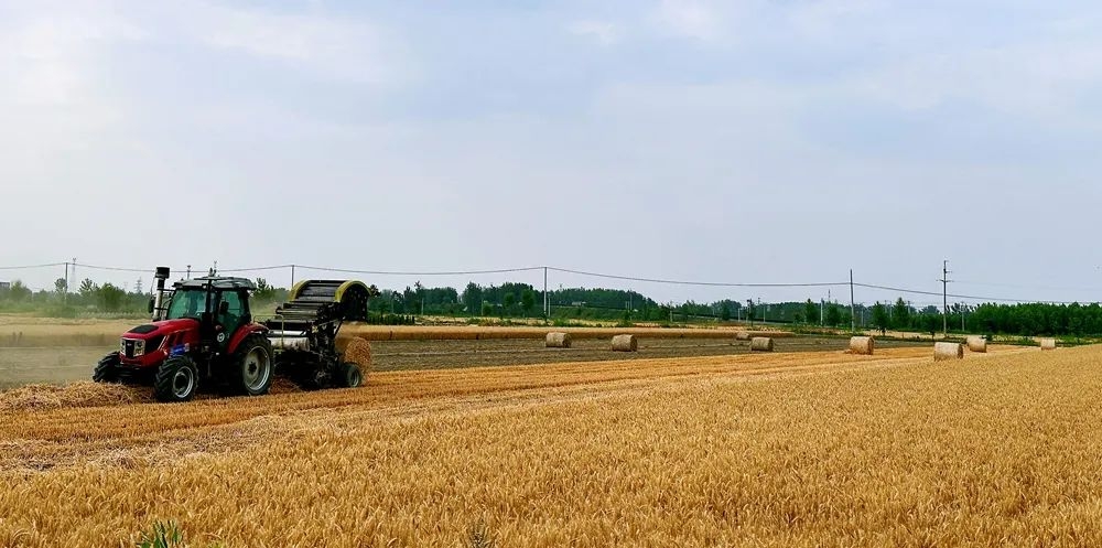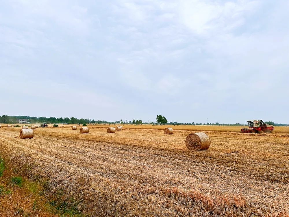 一台台秸秆回收打捆机来回穿梭在金色麦田中,忙着进行搂捡、压实、打捆工序。经过专业机械打包、作业,原本杂乱零散的秸秆变成了一捆捆圆形草堆,整齐地散落在田地,成为“三夏”生产中的一道风景线。据了解,打捆后的秸秆将运到养牛场用作畜禽饲料,实现秸秆资源化利用。