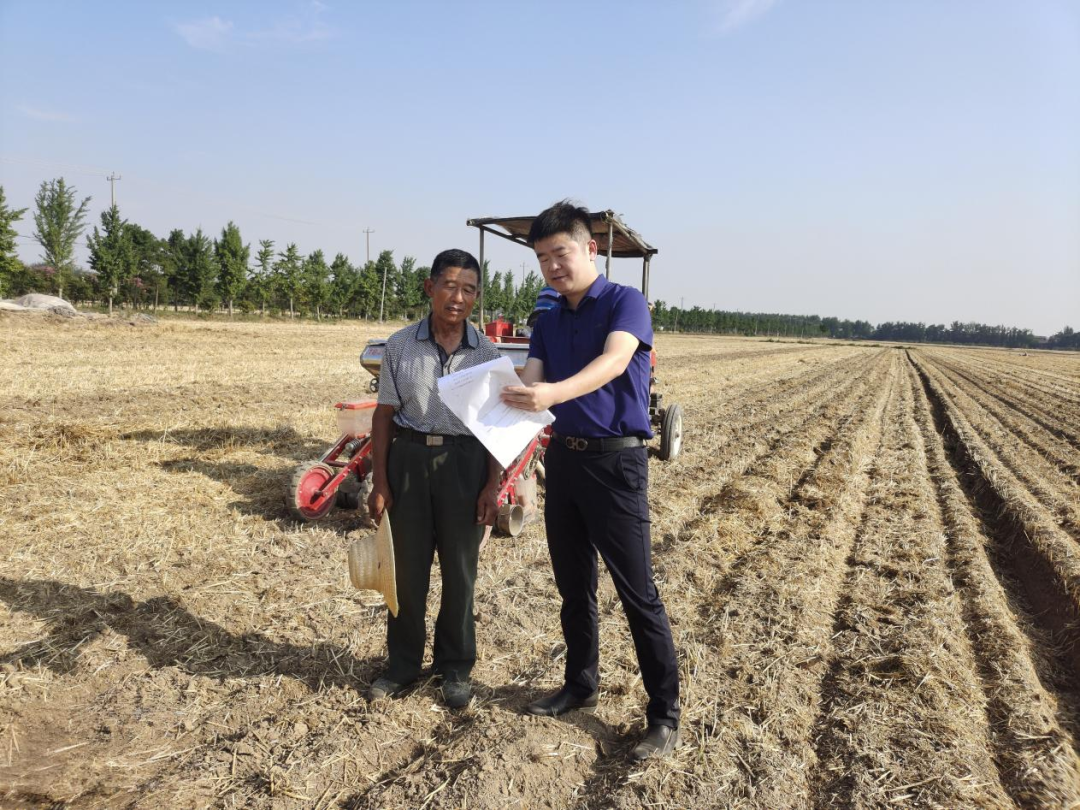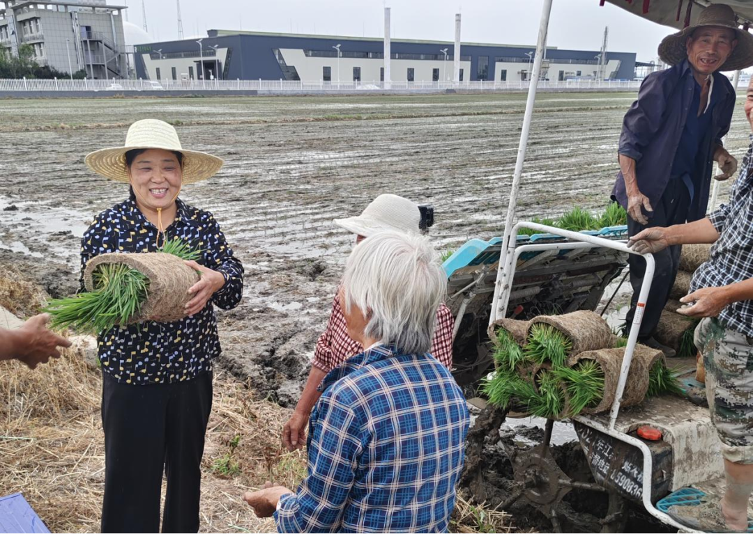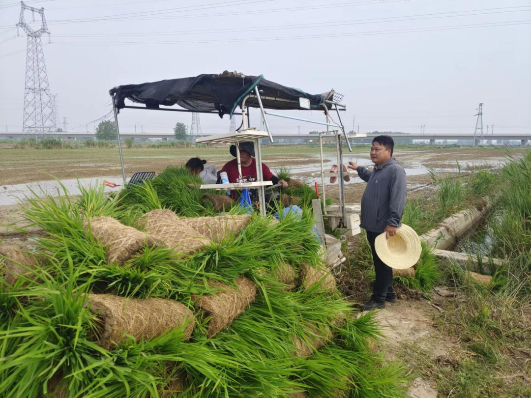 6月18日,大吴村党支部书记张晓猛到村合作社地块查看水稻机插情况,与插秧机手沟通,确保高效完成合作社860亩水稻种植。